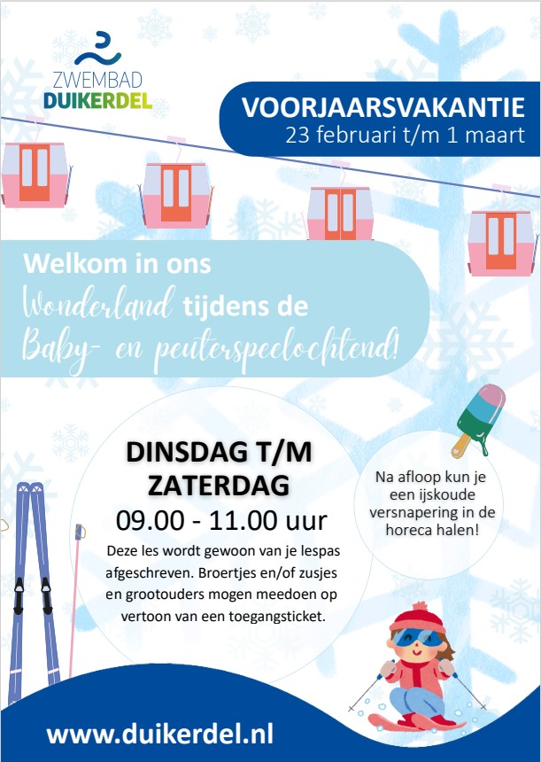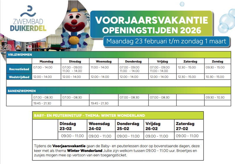 Vanaf maandag 23 februari t/m zondag 1 maart start de voorjaarsvakantie ook bij zwembad Duikerdel. Dit betekent dat wij een aangepast rooster hanteren.